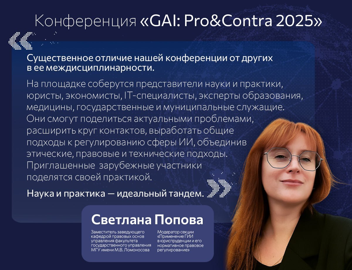 «Существенное отличие нашей конференции в ее междисциплинарности. На площадке соберутся представители науки и практики. Юристы, экономисты, специалисты сферы IT, образования, медицины, а также государственные и муниципальные служащие смогут поделиться актуальными проблемами, расширить круг контактов, выработать общие подходы к регулированию сферы ИИ, объединив этические, правовые и технические подходы. Приглашенные зарубежные участники поделятся своей практикой. Наука и практика - идеальный тандем».